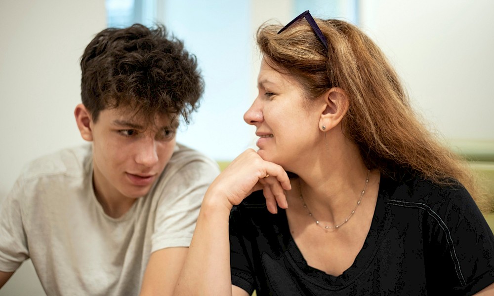 Een moeder praat met haar zoon van 15 jaar, middelbare scholier, 3 Havo